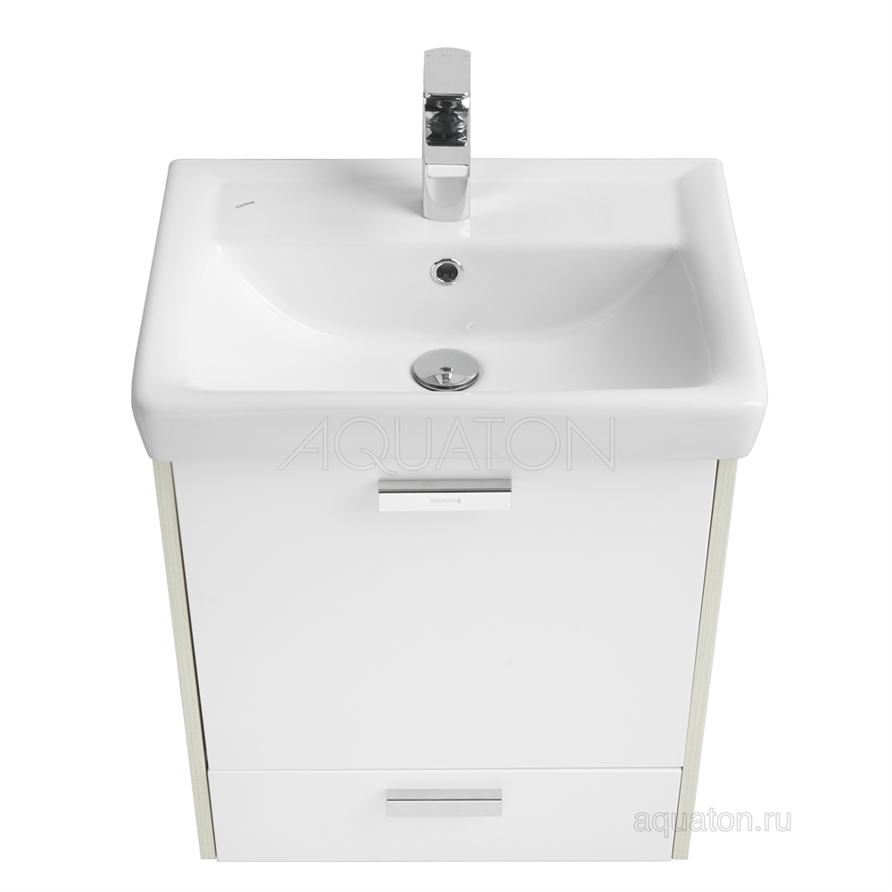 Тумба под раковину Йорк 55 М от AQUATON - практичное и функциональное решение для ванных комнат в современном стиле. Несомненные достоинства данной модели - простой удобный дизайн и компактные размеры. Разместить все необходимое позволит верхнее отделение, скрытое за распашной дверцей, и нижний выдвижной ящик с системой плавного закрывания. Корпус, изготовленный из влагостойкой ЛДСП с древесным декором под ясень, гармонично сочетается с белоснежным фасадом из МДФ, покрытым полиэфирной глянцевой краской ультрафиолетового отверждения. Оптимальная система хранения, петли с доводчиками и оригинальная фурнитура европейских производителей делают эту модель идеальным решением для небольшой ванной комнаты.