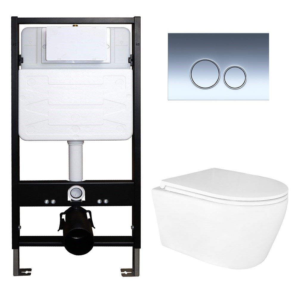 AZARIO Сет: Инсталляция для подвесного унитаза AZARIO FORTE + подвесной унитаз Azario UNO, безободковый + Кнопка смыва AZARIO FORTE, хром глянцевый (AZ-100-100F+AZ-2380+AZ-100-030F)
