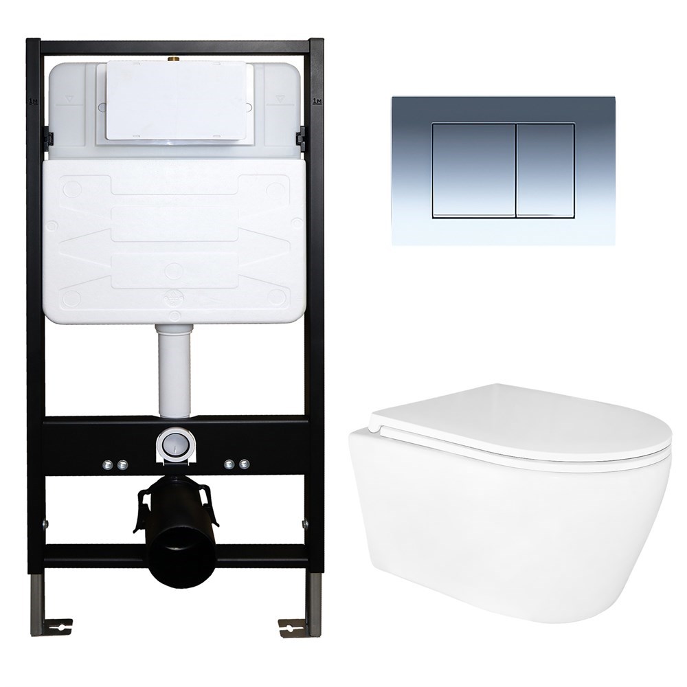 AZARIO Сет: Инсталляция для подвесного унитаза AZARIO FORTE + подвесной унитаз Azario UNO ТОРНАДО безободковый, слив "Скрытое Торнадо" + Кнопка смыва AZARIO FORTE, хром глянцевый (AZ-100-100F+AZ-2380+AZ-100-020F)