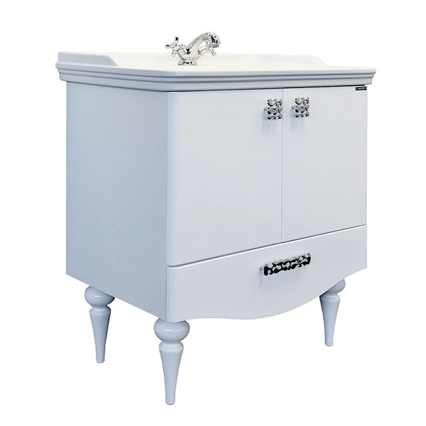 Напольная тумба-умывальник в неоклассическом стиле с двумя створками и нижним широким ящиком. Створки оснащены петлями с плавным закрыванием. Фасады тумбы покрыты белой глянцевой эмалью. Тумба укомплектована широкой и глубокой раковиной в классическом стиле с бортиком по периметру.