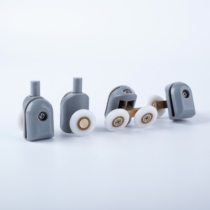 Комплект роликов для раздвижных дверей душевой кабины или ограждения. Подходят для стекол толщиной 4 мм. Комплект из 4 штук (2 верхних и 2 нижних ролика). Нейтральный серый цвет.