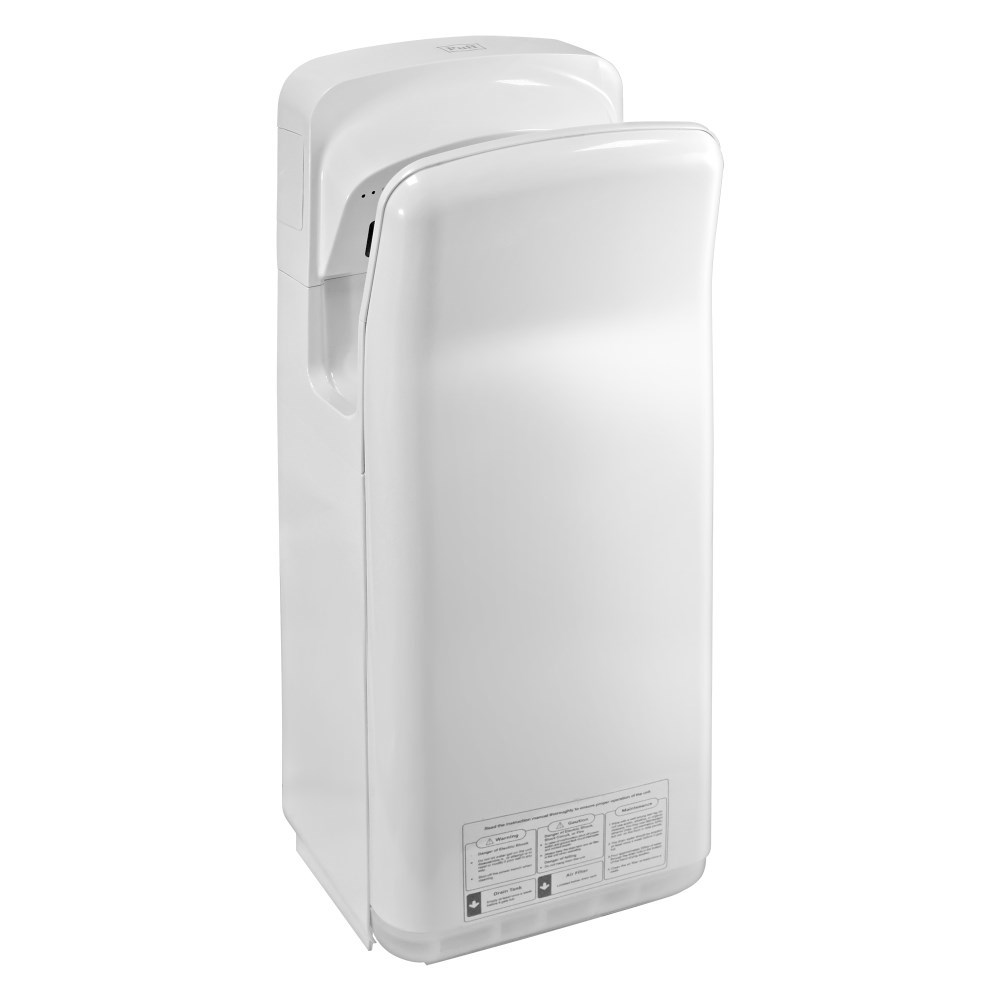 Данная модель снабжена переключателем холодный-горячий, что дает возможность использовать холодный воздух (при мощности устройства 900 Вт.) или горячий воздух (при мощности устройства в 2000 Вт.). Влага с рук собирается в каплесборнике объемом 0.5 л., который периодически необходимо опустошать (это не требует специальных навыков).