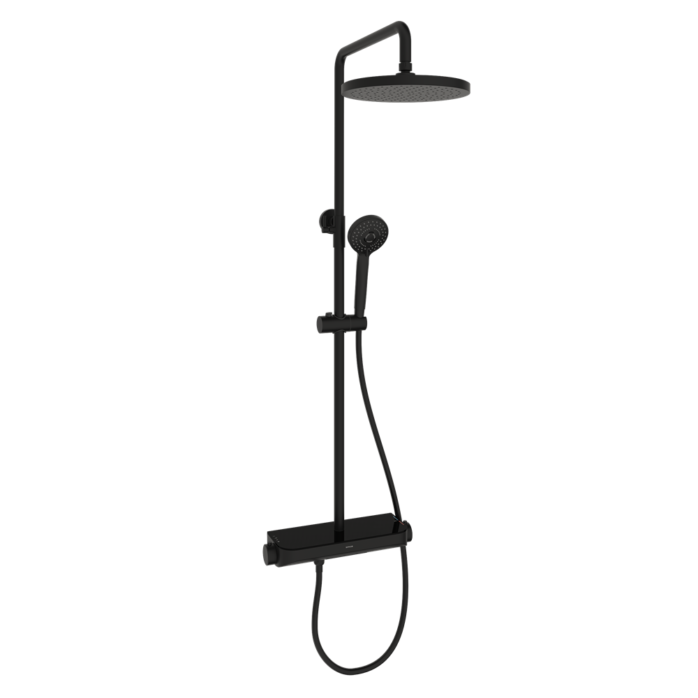SANCOS Душевая стойка Teo c термостатом, встроенным изливом, полкой и с регулировкой по высоте штанги, c верхним душем ?250 мм , ручным душем ?100 мм, 3 режима, цвет черный матовый, арт. SC11002MB