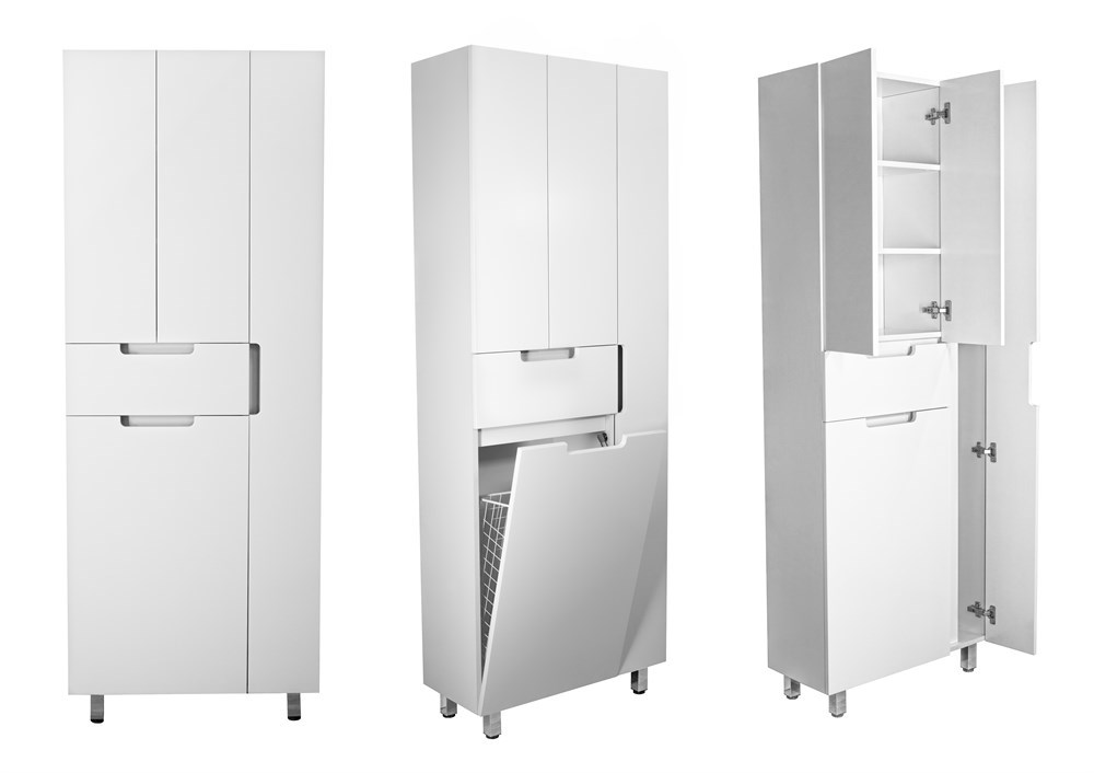 Колонна Style Line "Оптима 700" оснащена большой откидной корзиной для белья в нижней части. За распашными дверцами в верхней части колонны Style Line "Оптима 700" находится отделение с полочками. Средний выдвижной ящик подойдет для мелких принадлежностей. Уникальность колонны Style Line "Оптима 700" заключается в ее дополнительном отделении под халаты. Ширина колонны составляет 70 см, фасады и корпус выполнены в белом глянцевом цвете, удобные ручки зацепы не отвлекают взгляд, а являются гармоничным продолжением каждой части колонны.