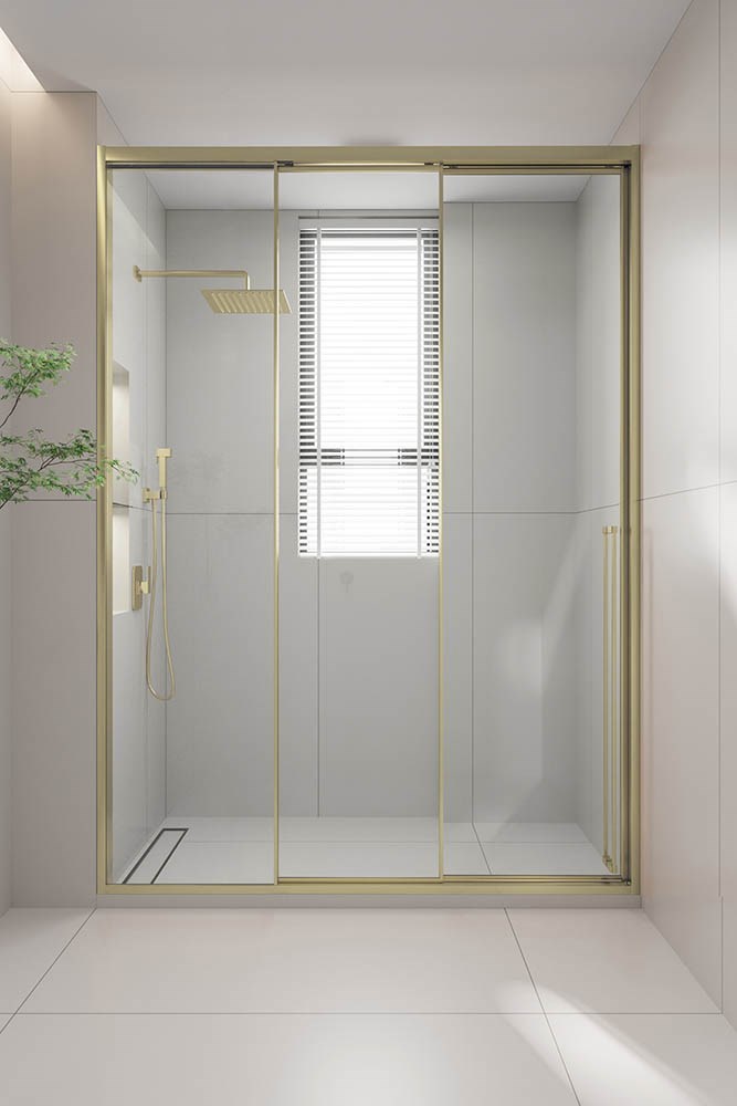 VECONI Душевая дверь раздвижная Premium Prato 300 G-L, 1300х2000, золото брашированный, стекло прозрачное
